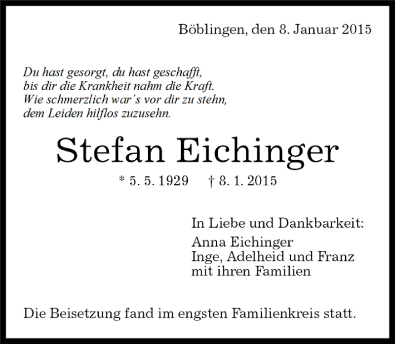 Hier finden Sie alle Traueranzeigen aus der Zeitung, die bisher für Stefan Eichinger erschienen sind. Weitere Traueranzeigen, die in der Zeitung erscheinen, werden hier ebenfalls aufgelistet