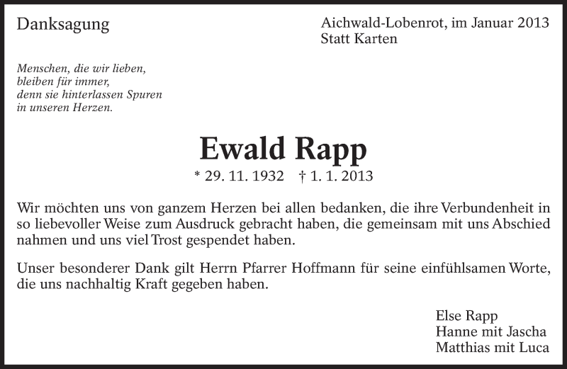 Hier finden Sie alle Traueranzeigen aus der Zeitung, die bisher für Stefan Kahnmeyer erschienen sind. Weitere Traueranzeigen, die in der Zeitung erscheinen, werden hier ebenfalls aufgelistet