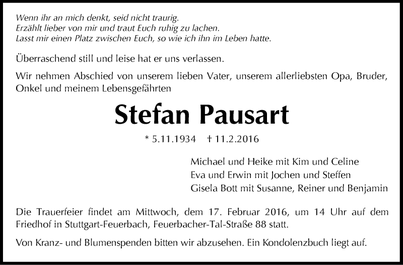Hier finden Sie alle Traueranzeigen aus der Zeitung, die bisher für Stefan Pausart erschienen sind. Weitere Traueranzeigen, die in der Zeitung erscheinen, werden hier ebenfalls aufgelistet