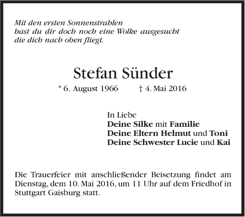 Hier finden Sie alle Traueranzeigen aus der Zeitung, die bisher für Stefan Sünder erschienen sind. Weitere Traueranzeigen, die in der Zeitung erscheinen, werden hier ebenfalls aufgelistet