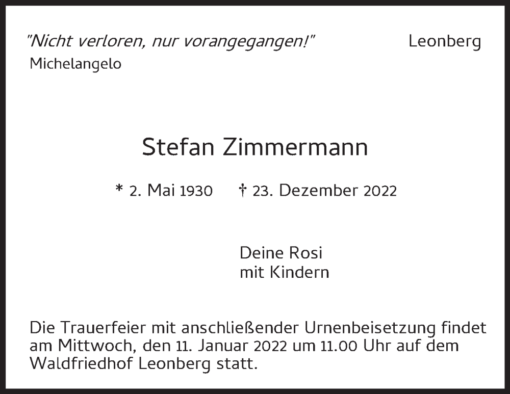 Hier finden Sie alle Traueranzeigen aus der Zeitung, die bisher für Stefan Zimmermann erschienen sind. Weitere Traueranzeigen, die in der Zeitung erscheinen, werden hier ebenfalls aufgelistet