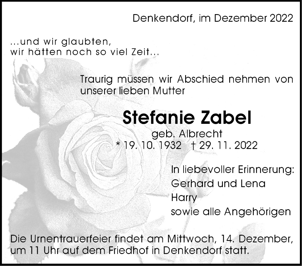 Hier finden Sie alle Traueranzeigen aus der Zeitung, die bisher für Stefanie Zabel erschienen sind. Weitere Traueranzeigen, die in der Zeitung erscheinen, werden hier ebenfalls aufgelistet