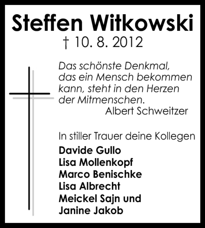 Hier finden Sie alle Traueranzeigen aus der Zeitung, die bisher für Steffen Witkowski erschienen sind. Weitere Traueranzeigen, die in der Zeitung erscheinen, werden hier ebenfalls aufgelistet