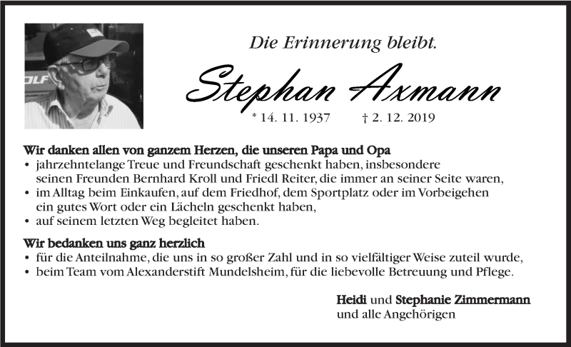 Hier finden Sie alle Traueranzeigen aus der Zeitung, die bisher für Stephan Axmann erschienen sind. Weitere Traueranzeigen, die in der Zeitung erscheinen, werden hier ebenfalls aufgelistet