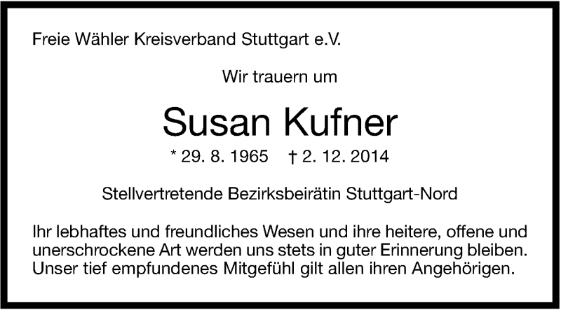 Hier finden Sie alle Traueranzeigen aus der Zeitung, die bisher für Susan Kufner erschienen sind. Weitere Traueranzeigen, die in der Zeitung erscheinen, werden hier ebenfalls aufgelistet