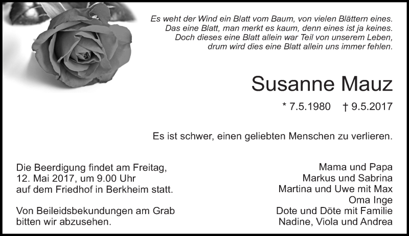 Hier finden Sie alle Traueranzeigen aus der Zeitung, die bisher für Susanne Mauz erschienen sind. Weitere Traueranzeigen, die in der Zeitung erscheinen, werden hier ebenfalls aufgelistet