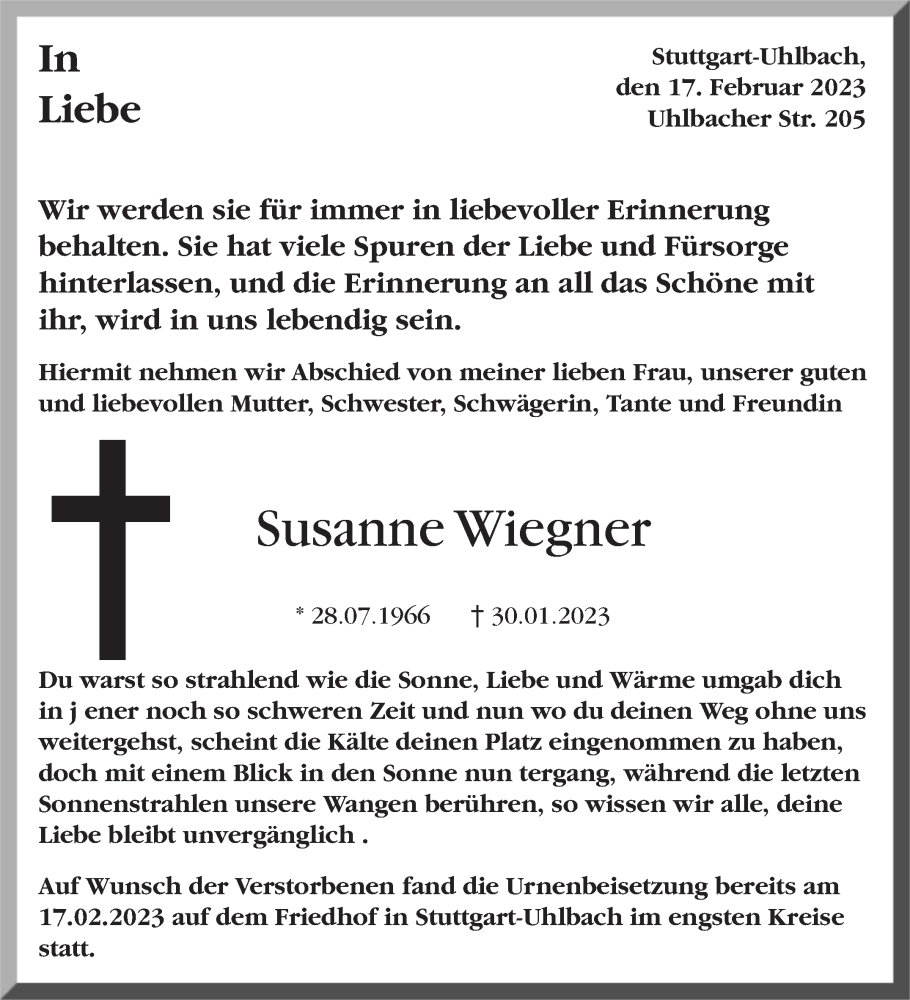 Hier finden Sie alle Traueranzeigen aus der Zeitung, die bisher für Susanne Wiegner erschienen sind. Weitere Traueranzeigen, die in der Zeitung erscheinen, werden hier ebenfalls aufgelistet
