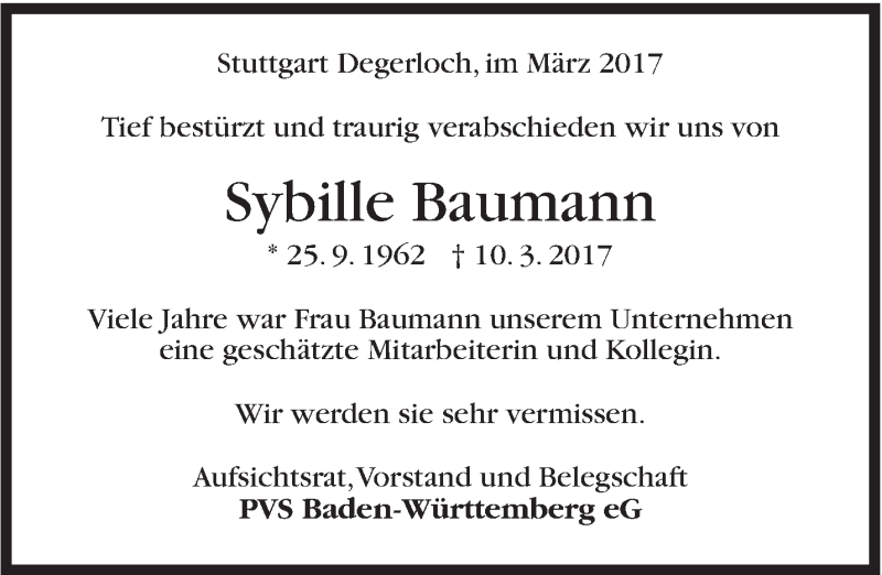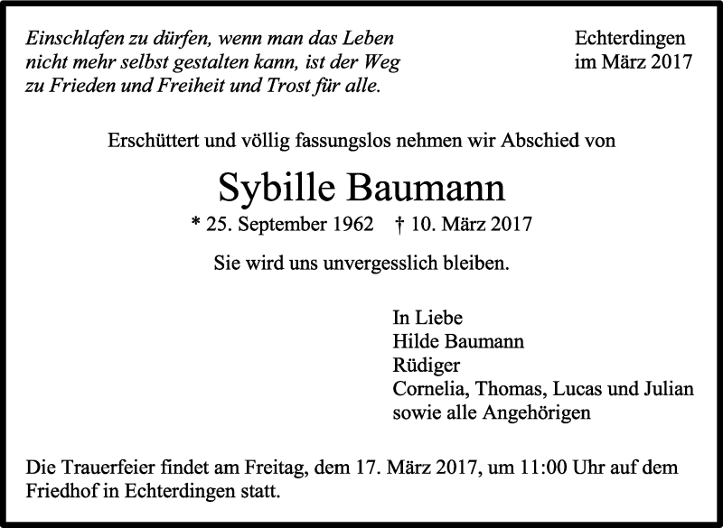 Hier finden Sie alle Traueranzeigen aus der Zeitung, die bisher für Sybille Baumann erschienen sind. Weitere Traueranzeigen, die in der Zeitung erscheinen, werden hier ebenfalls aufgelistet