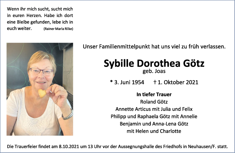 Hier finden Sie alle Traueranzeigen aus der Zeitung, die bisher für Sybille Dorothea Götz erschienen sind. Weitere Traueranzeigen, die in der Zeitung erscheinen, werden hier ebenfalls aufgelistet