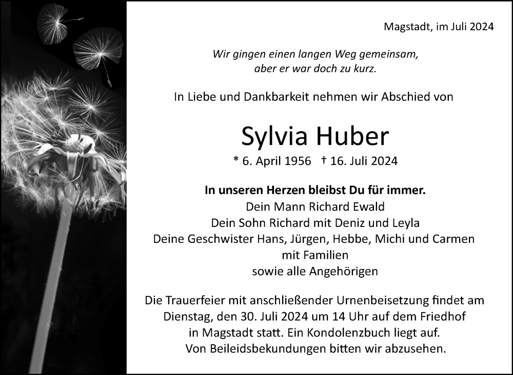 Hier finden Sie alle Traueranzeigen aus der Zeitung, die bisher für Sylvia Huber erschienen sind. Weitere Traueranzeigen, die in der Zeitung erscheinen, werden hier ebenfalls aufgelistet