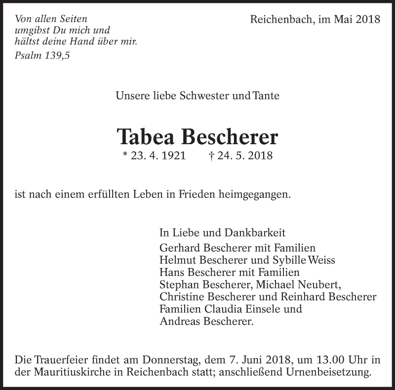 Hier finden Sie alle Traueranzeigen aus der Zeitung, die bisher für Tabea Bescherer erschienen sind. Weitere Traueranzeigen, die in der Zeitung erscheinen, werden hier ebenfalls aufgelistet