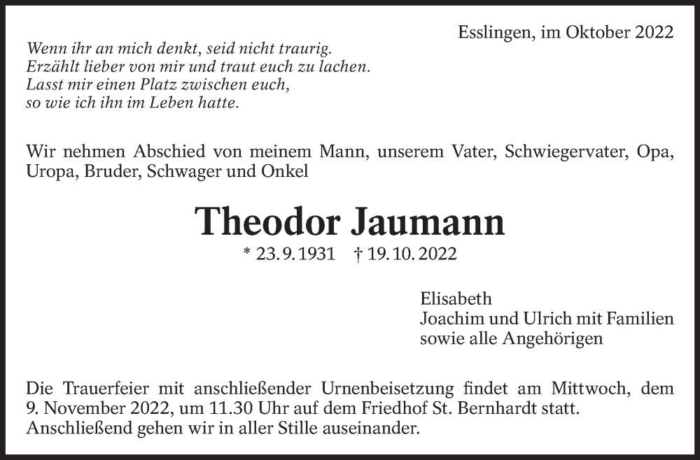 Hier finden Sie alle Traueranzeigen aus der Zeitung, die bisher für Theodor Jaumann erschienen sind. Weitere Traueranzeigen, die in der Zeitung erscheinen, werden hier ebenfalls aufgelistet