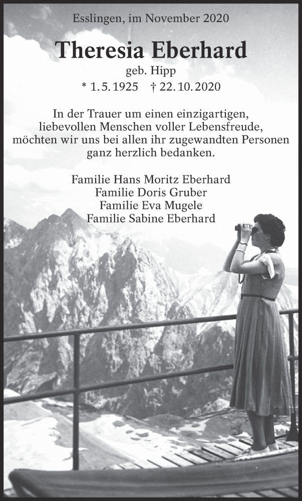 Hier finden Sie alle Traueranzeigen aus der Zeitung, die bisher für Theresia Eberhard erschienen sind. Weitere Traueranzeigen, die in der Zeitung erscheinen, werden hier ebenfalls aufgelistet