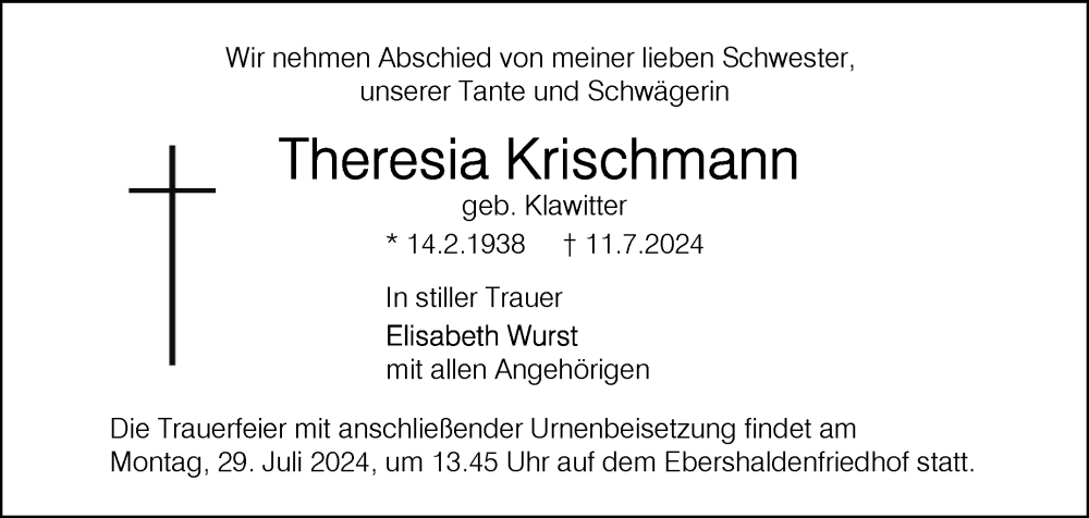 Hier finden Sie alle Traueranzeigen aus der Zeitung, die bisher für Theresia Krischmann erschienen sind. Weitere Traueranzeigen, die in der Zeitung erscheinen, werden hier ebenfalls aufgelistet