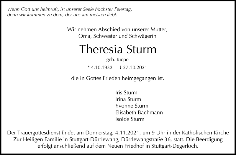 Hier finden Sie alle Traueranzeigen aus der Zeitung, die bisher für Theresia Sturm erschienen sind. Weitere Traueranzeigen, die in der Zeitung erscheinen, werden hier ebenfalls aufgelistet