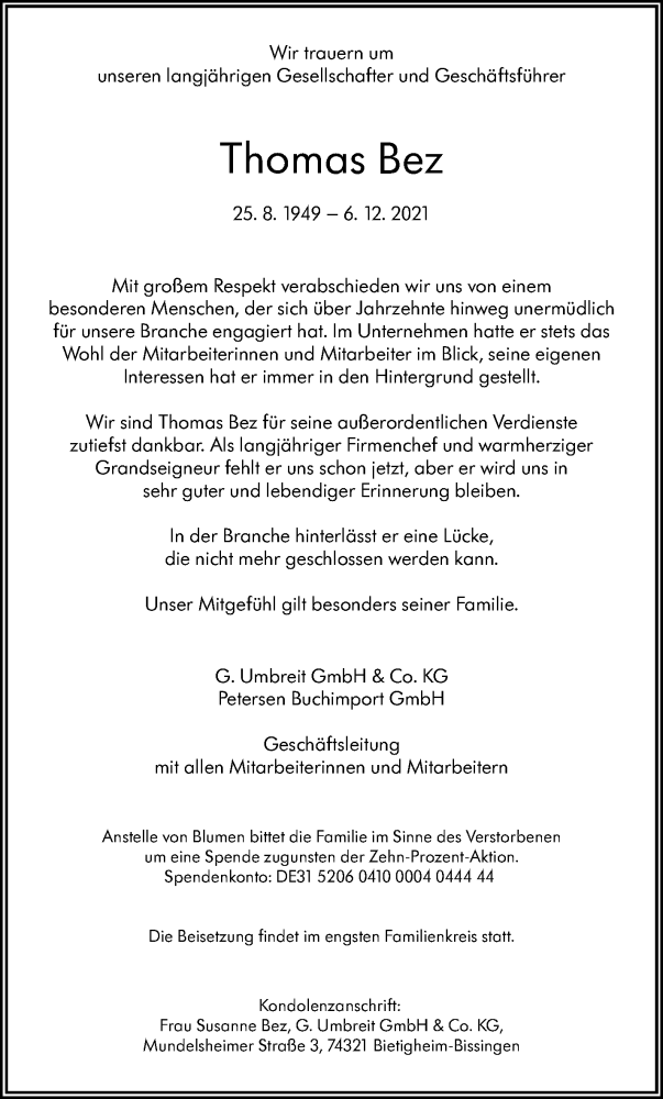 Hier finden Sie alle Traueranzeigen aus der Zeitung, die bisher für Thomas Bez erschienen sind. Weitere Traueranzeigen, die in der Zeitung erscheinen, werden hier ebenfalls aufgelistet