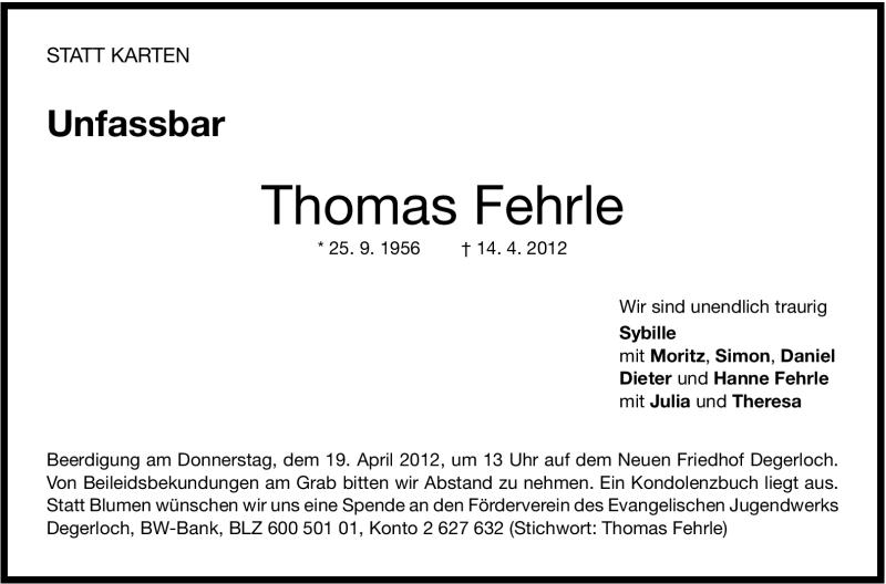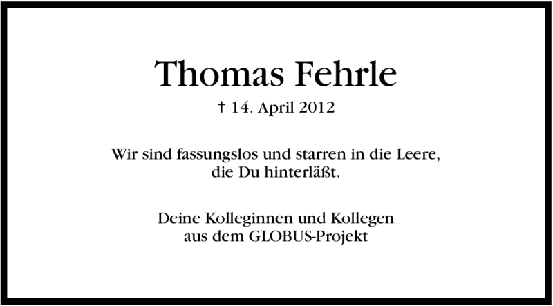 Hier finden Sie alle Traueranzeigen aus der Zeitung, die bisher für Thomas Fehrle erschienen sind. Weitere Traueranzeigen, die in der Zeitung erscheinen, werden hier ebenfalls aufgelistet