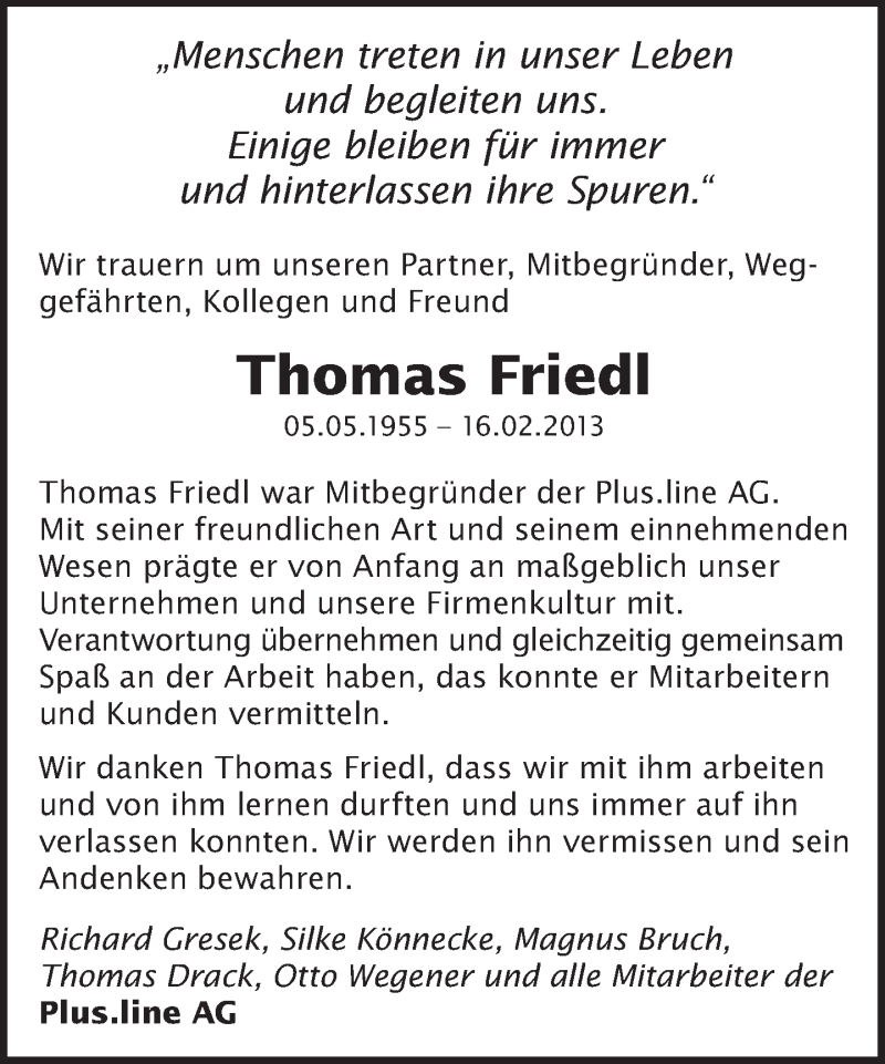 Hier finden Sie alle Traueranzeigen aus der Zeitung, die bisher für Thomas Friedl erschienen sind. Weitere Traueranzeigen, die in der Zeitung erscheinen, werden hier ebenfalls aufgelistet