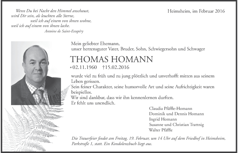 Hier finden Sie alle Traueranzeigen aus der Zeitung, die bisher für Thomas Homann erschienen sind. Weitere Traueranzeigen, die in der Zeitung erscheinen, werden hier ebenfalls aufgelistet