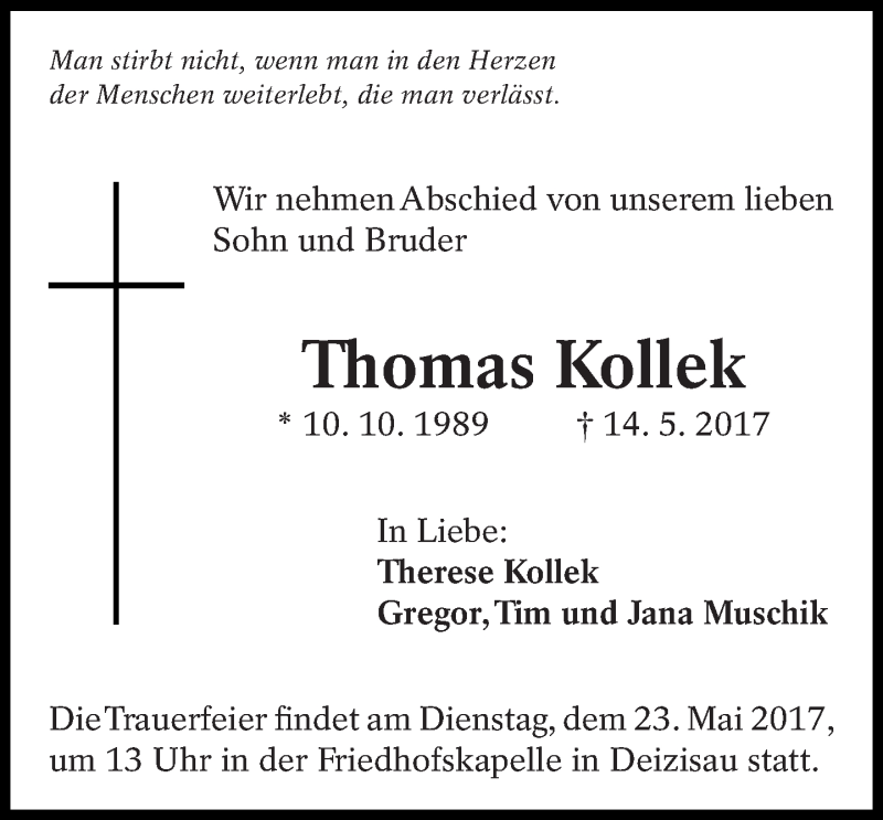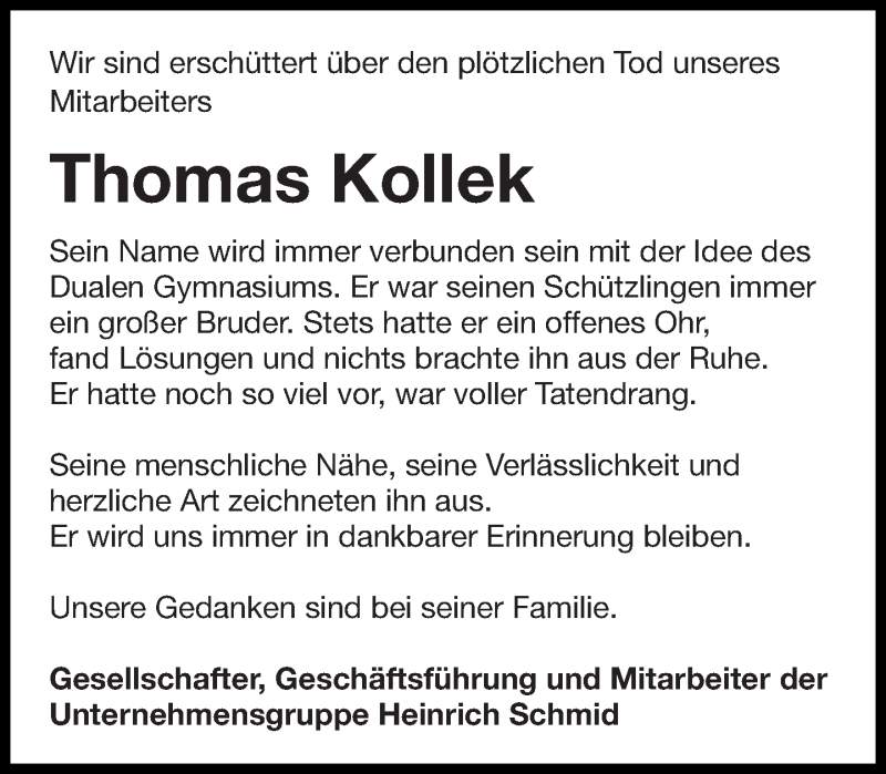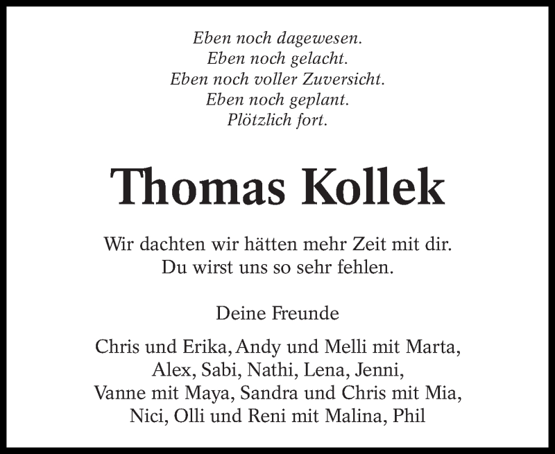Hier finden Sie alle Traueranzeigen aus der Zeitung, die bisher für Thomas Kollek erschienen sind. Weitere Traueranzeigen, die in der Zeitung erscheinen, werden hier ebenfalls aufgelistet