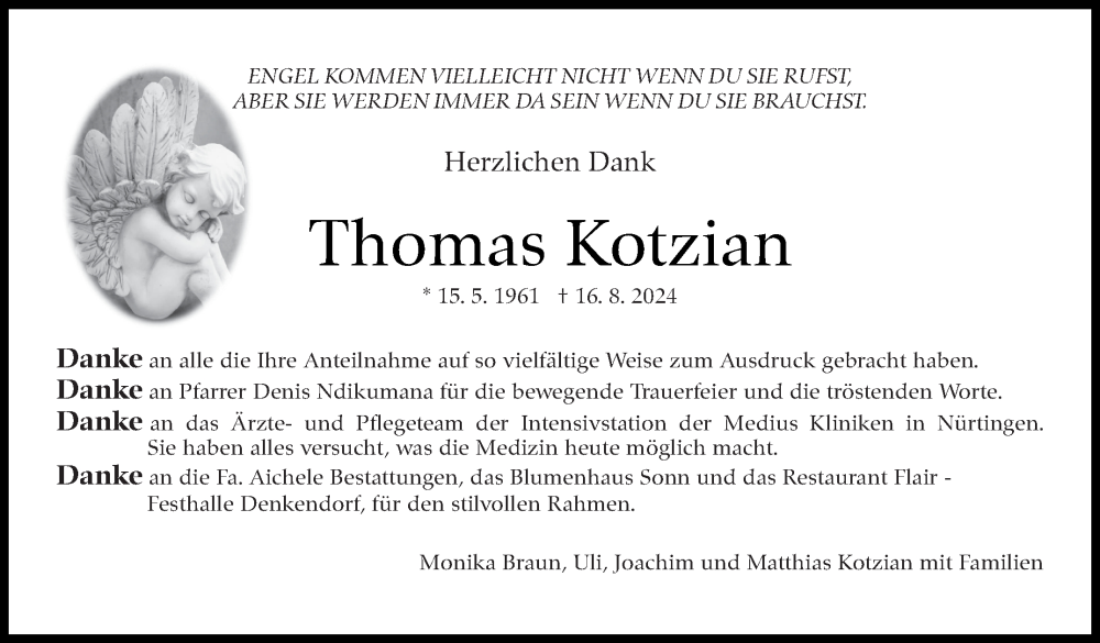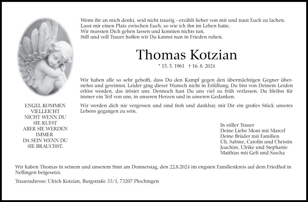 Hier finden Sie alle Traueranzeigen aus der Zeitung, die bisher für Thomas Kotzian erschienen sind. Weitere Traueranzeigen, die in der Zeitung erscheinen, werden hier ebenfalls aufgelistet