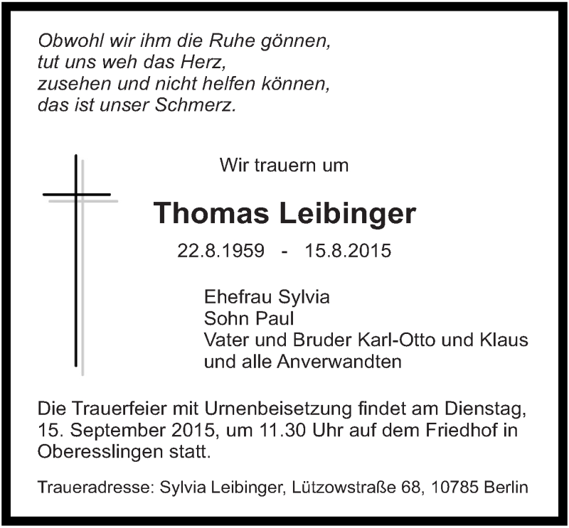 Hier finden Sie alle Traueranzeigen aus der Zeitung, die bisher für Thomas Leibinger erschienen sind. Weitere Traueranzeigen, die in der Zeitung erscheinen, werden hier ebenfalls aufgelistet