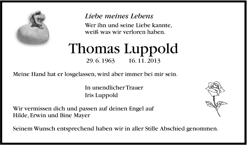 Hier finden Sie alle Traueranzeigen aus der Zeitung, die bisher für Thomas Luppold erschienen sind. Weitere Traueranzeigen, die in der Zeitung erscheinen, werden hier ebenfalls aufgelistet
