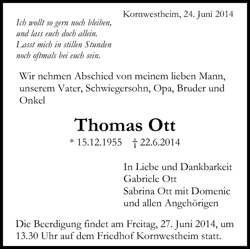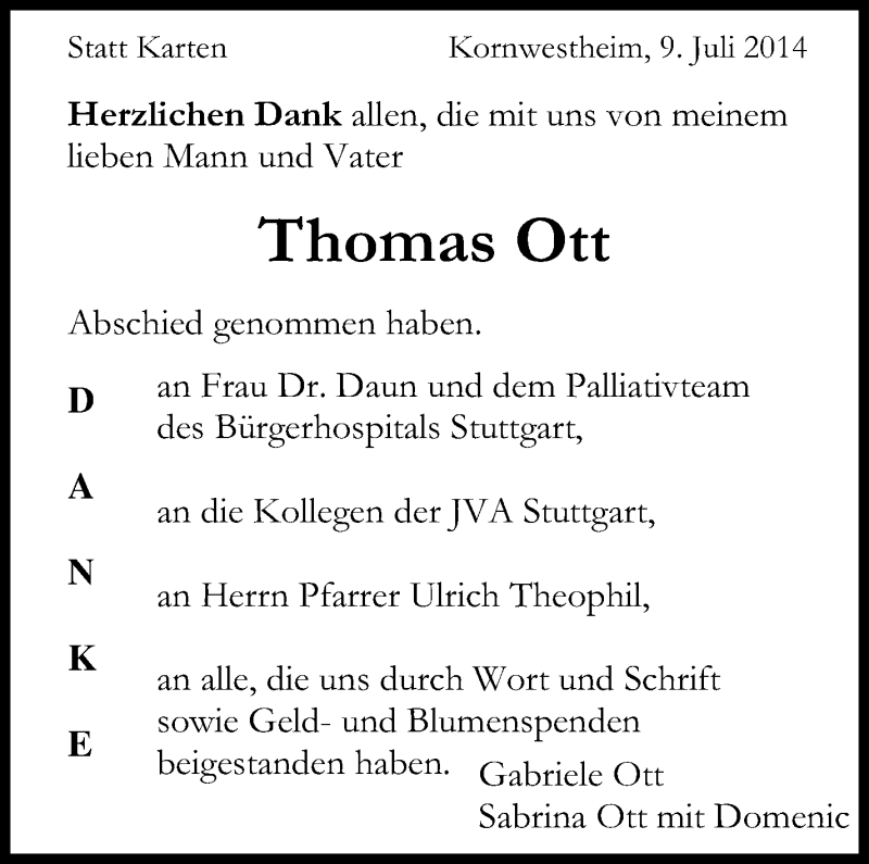 Hier finden Sie alle Traueranzeigen aus der Zeitung, die bisher für Thomas Ott erschienen sind. Weitere Traueranzeigen, die in der Zeitung erscheinen, werden hier ebenfalls aufgelistet