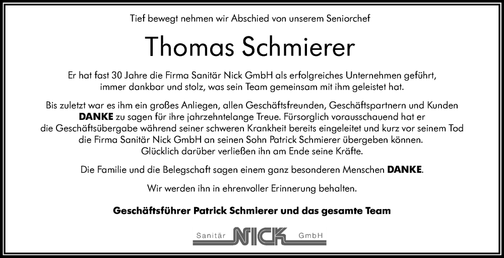 Hier finden Sie alle Traueranzeigen aus der Zeitung, die bisher für Thomas Schmierer erschienen sind. Weitere Traueranzeigen, die in der Zeitung erscheinen, werden hier ebenfalls aufgelistet