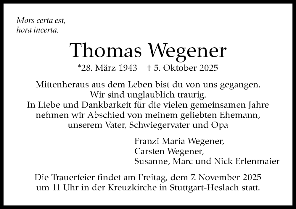 Hier finden Sie alle Traueranzeigen aus der Zeitung, die bisher für Thomas Wegener erschienen sind. Weitere Traueranzeigen, die in der Zeitung erscheinen, werden hier ebenfalls aufgelistet