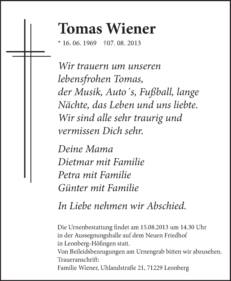 Hier finden Sie alle Traueranzeigen aus der Zeitung, die bisher für Thomas Wiener erschienen sind. Weitere Traueranzeigen, die in der Zeitung erscheinen, werden hier ebenfalls aufgelistet