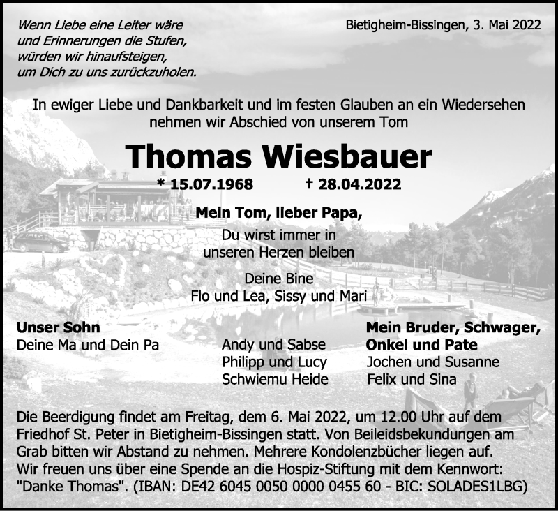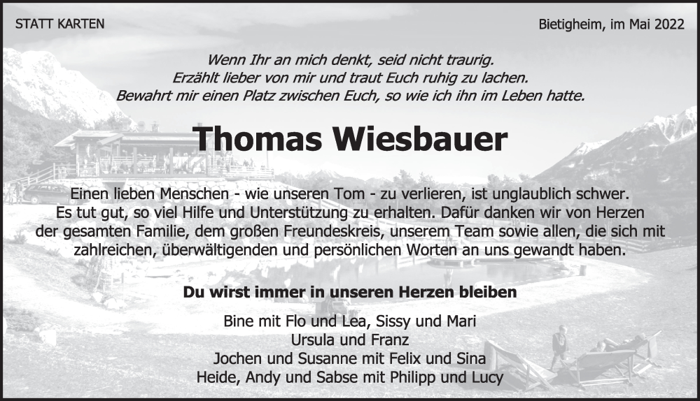 Hier finden Sie alle Traueranzeigen aus der Zeitung, die bisher für Thomas Wiesbauer erschienen sind. Weitere Traueranzeigen, die in der Zeitung erscheinen, werden hier ebenfalls aufgelistet