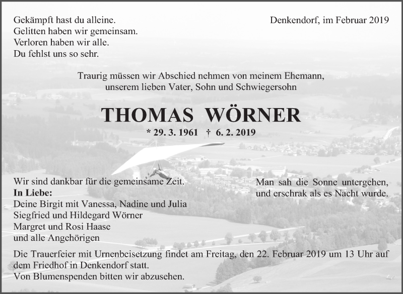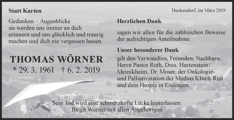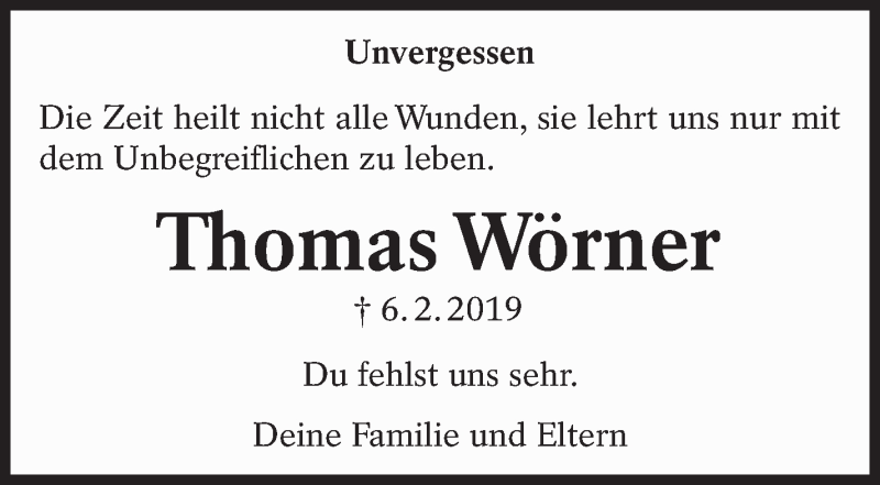 Hier finden Sie alle Traueranzeigen aus der Zeitung, die bisher für Thomas Wörner erschienen sind. Weitere Traueranzeigen, die in der Zeitung erscheinen, werden hier ebenfalls aufgelistet