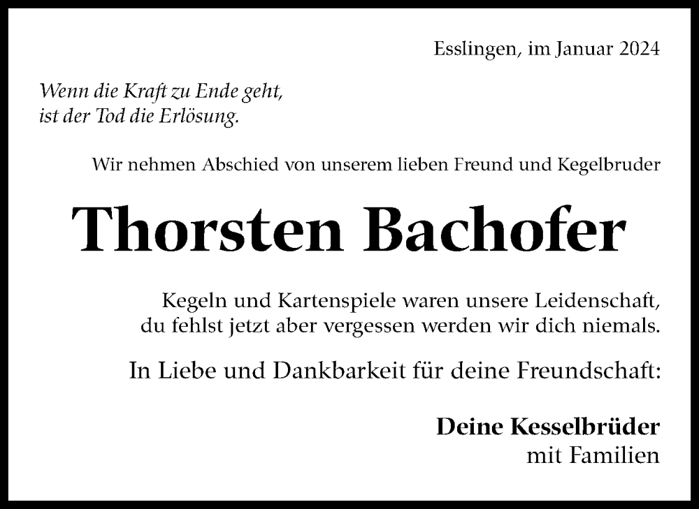 Hier finden Sie alle Traueranzeigen aus der Zeitung, die bisher für Thorsten Bachofer erschienen sind. Weitere Traueranzeigen, die in der Zeitung erscheinen, werden hier ebenfalls aufgelistet