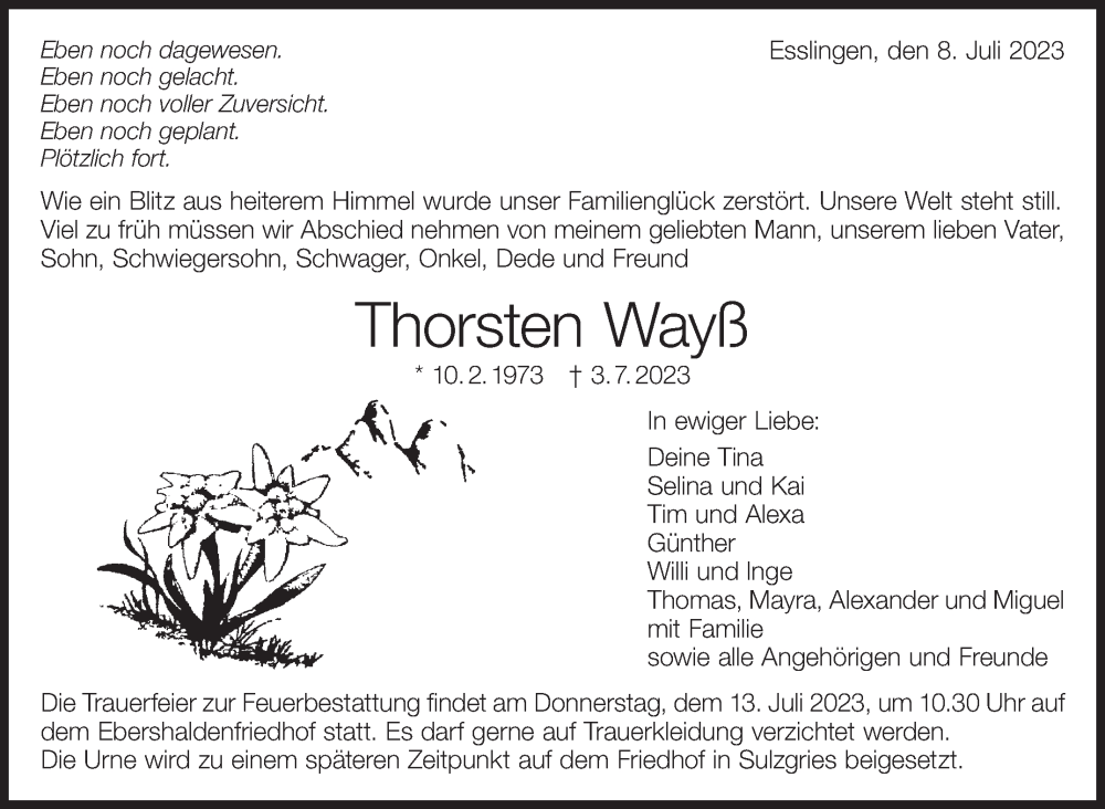 Hier finden Sie alle Traueranzeigen aus der Zeitung, die bisher für Thorsten Wayß erschienen sind. Weitere Traueranzeigen, die in der Zeitung erscheinen, werden hier ebenfalls aufgelistet
