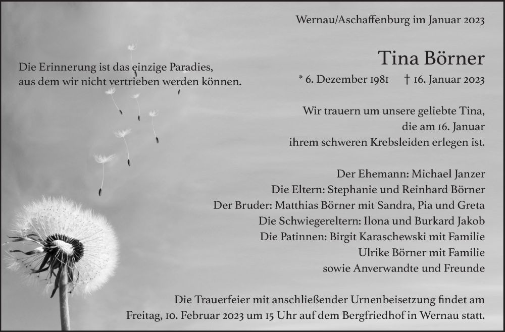 Hier finden Sie alle Traueranzeigen aus der Zeitung, die bisher für Tina Börner erschienen sind. Weitere Traueranzeigen, die in der Zeitung erscheinen, werden hier ebenfalls aufgelistet