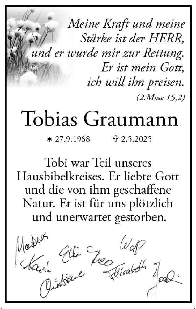 Hier finden Sie alle Traueranzeigen aus der Zeitung, die bisher für Tobias Graumann erschienen sind. Weitere Traueranzeigen, die in der Zeitung erscheinen, werden hier ebenfalls aufgelistet