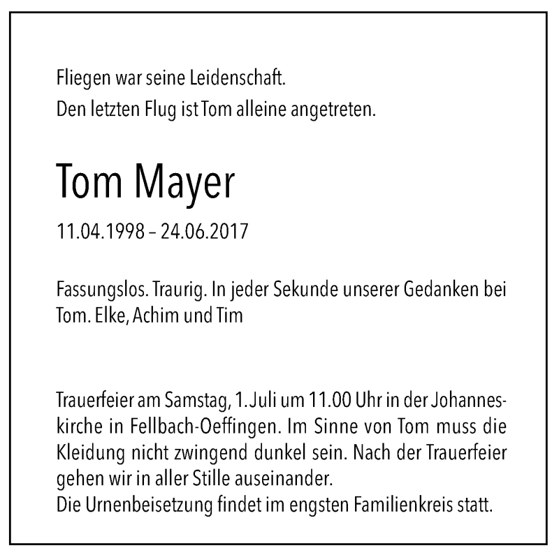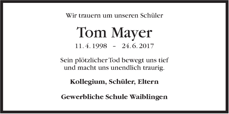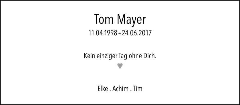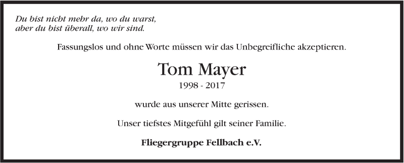 Hier finden Sie alle Traueranzeigen aus der Zeitung, die bisher für Tom Mayer erschienen sind. Weitere Traueranzeigen, die in der Zeitung erscheinen, werden hier ebenfalls aufgelistet