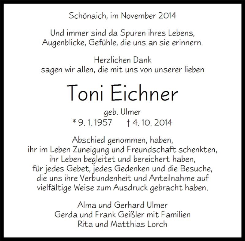 Hier finden Sie alle Traueranzeigen aus der Zeitung, die bisher für Toni Eichner erschienen sind. Weitere Traueranzeigen, die in der Zeitung erscheinen, werden hier ebenfalls aufgelistet