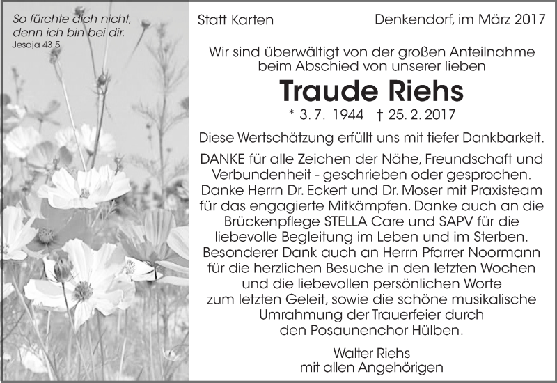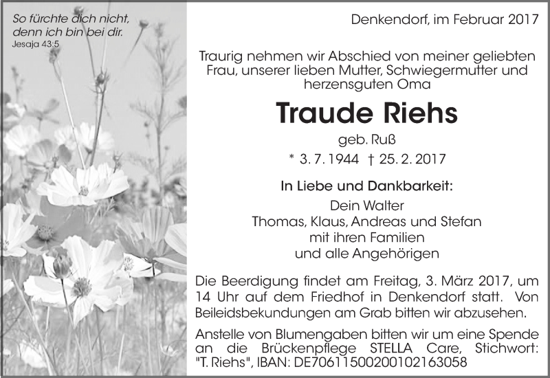 Hier finden Sie alle Traueranzeigen aus der Zeitung, die bisher für Traude Riehs erschienen sind. Weitere Traueranzeigen, die in der Zeitung erscheinen, werden hier ebenfalls aufgelistet