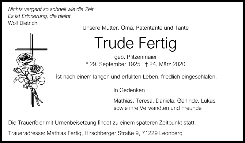 Hier finden Sie alle Traueranzeigen aus der Zeitung, die bisher für Trude Fertig erschienen sind. Weitere Traueranzeigen, die in der Zeitung erscheinen, werden hier ebenfalls aufgelistet