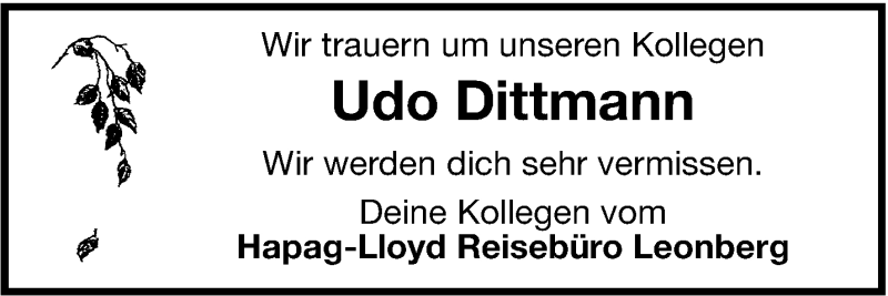 Hier finden Sie alle Traueranzeigen aus der Zeitung, die bisher für Udo Dittmann erschienen sind. Weitere Traueranzeigen, die in der Zeitung erscheinen, werden hier ebenfalls aufgelistet