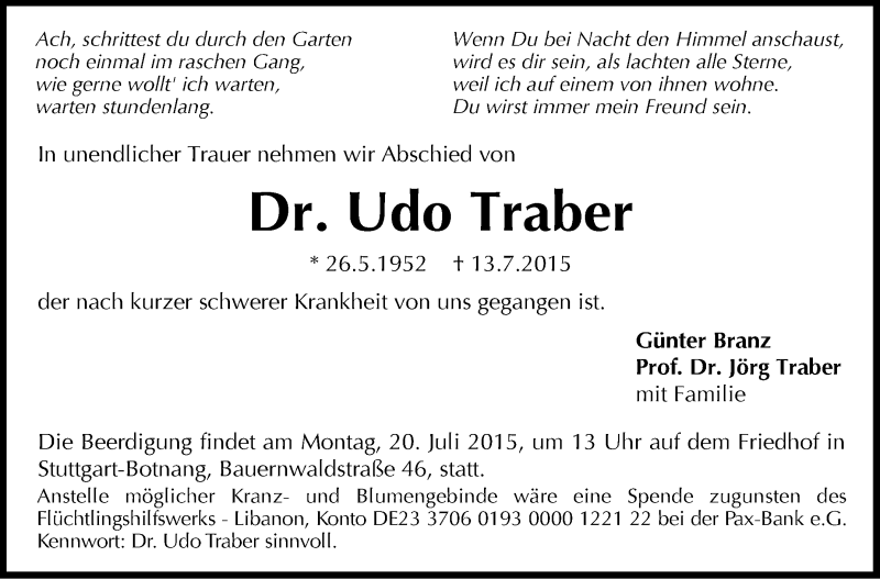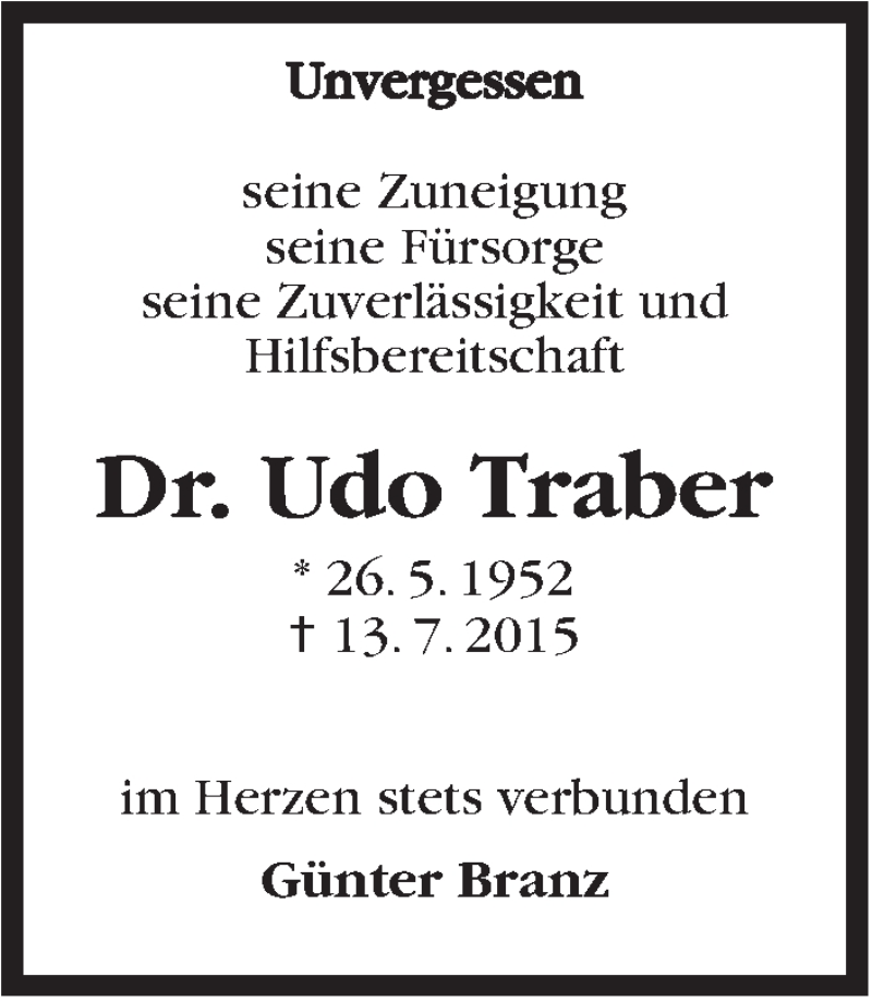 Hier finden Sie alle Traueranzeigen aus der Zeitung, die bisher für Udo Traber erschienen sind. Weitere Traueranzeigen, die in der Zeitung erscheinen, werden hier ebenfalls aufgelistet