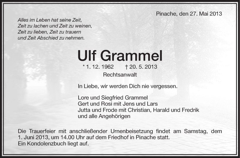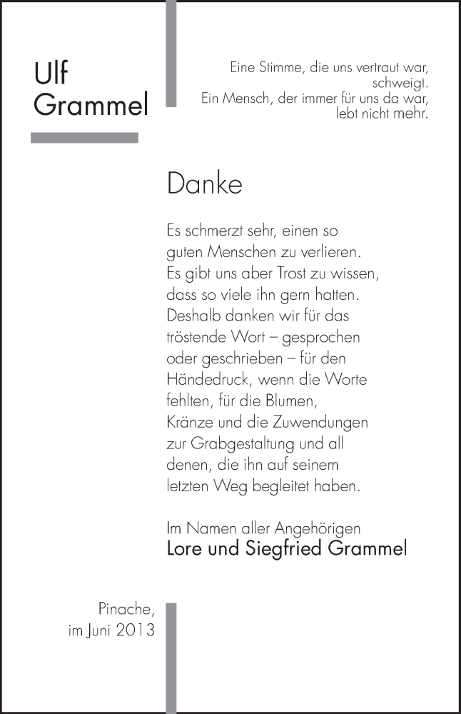 Hier finden Sie alle Traueranzeigen aus der Zeitung, die bisher für Ulf Grammel erschienen sind. Weitere Traueranzeigen, die in der Zeitung erscheinen, werden hier ebenfalls aufgelistet