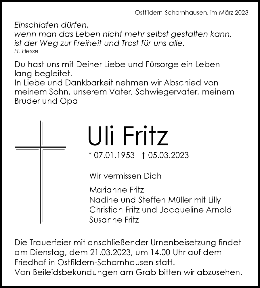 Hier finden Sie alle Traueranzeigen aus der Zeitung, die bisher für Uli Fritz erschienen sind. Weitere Traueranzeigen, die in der Zeitung erscheinen, werden hier ebenfalls aufgelistet