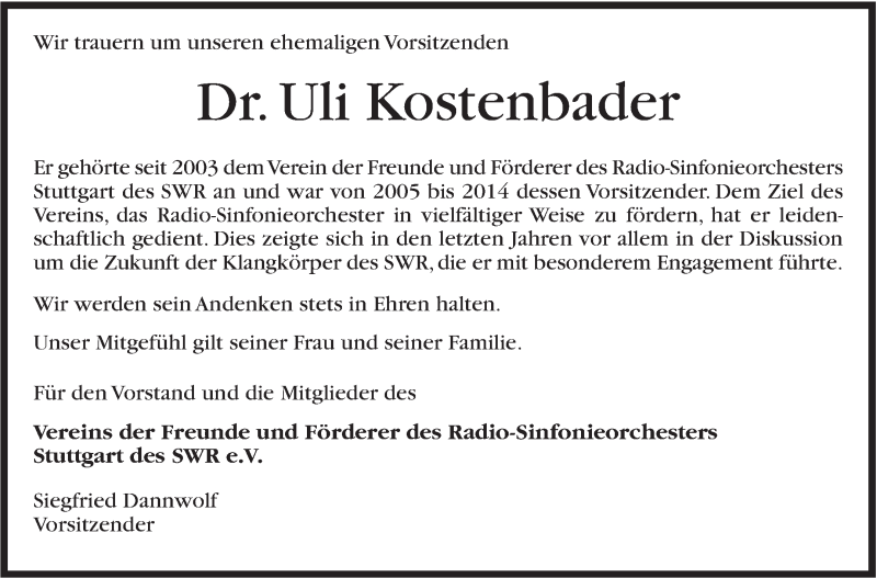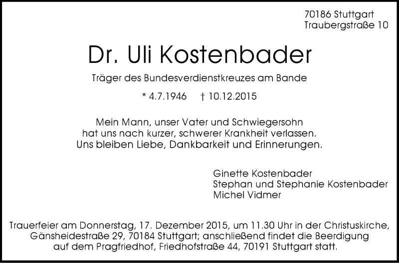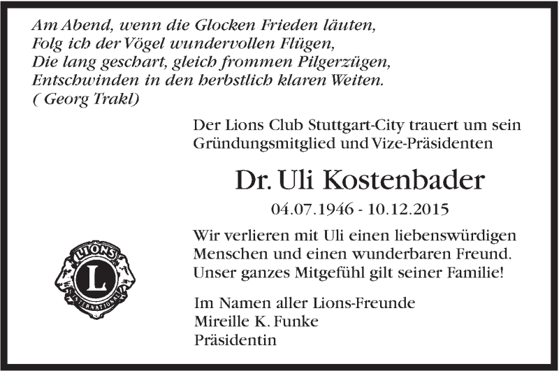 Hier finden Sie alle Traueranzeigen aus der Zeitung, die bisher für Uli Kostenbader erschienen sind. Weitere Traueranzeigen, die in der Zeitung erscheinen, werden hier ebenfalls aufgelistet