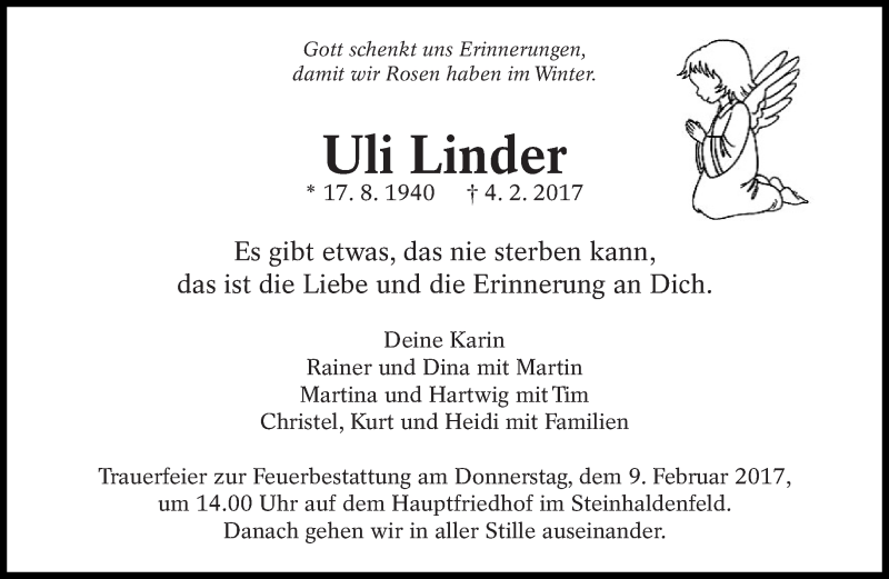 Hier finden Sie alle Traueranzeigen aus der Zeitung, die bisher für Uli Linder erschienen sind. Weitere Traueranzeigen, die in der Zeitung erscheinen, werden hier ebenfalls aufgelistet