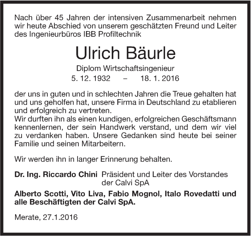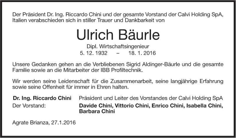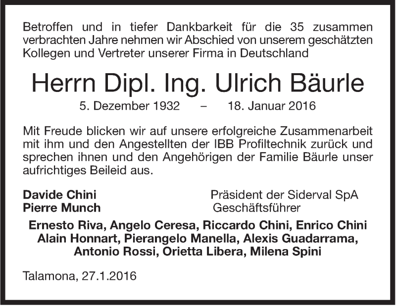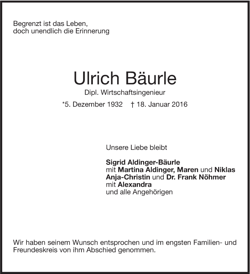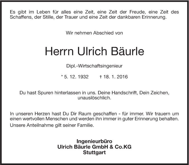 Hier finden Sie alle Traueranzeigen aus der Zeitung, die bisher für Ulrich Bäurle erschienen sind. Weitere Traueranzeigen, die in der Zeitung erscheinen, werden hier ebenfalls aufgelistet