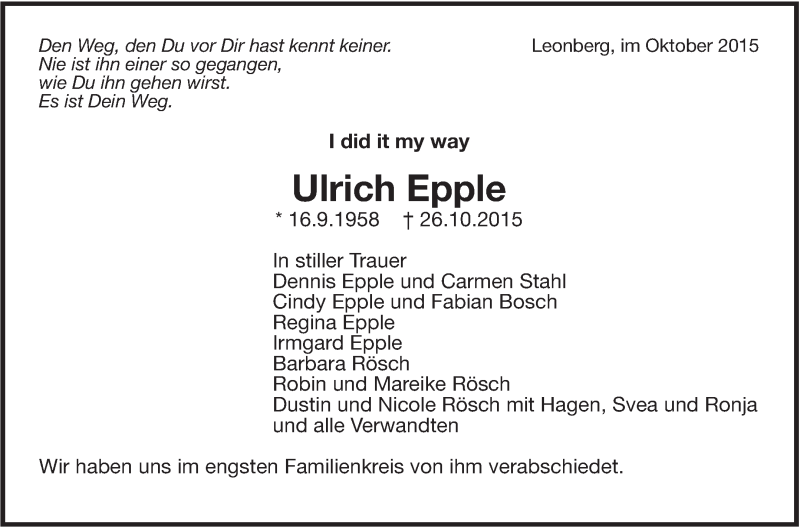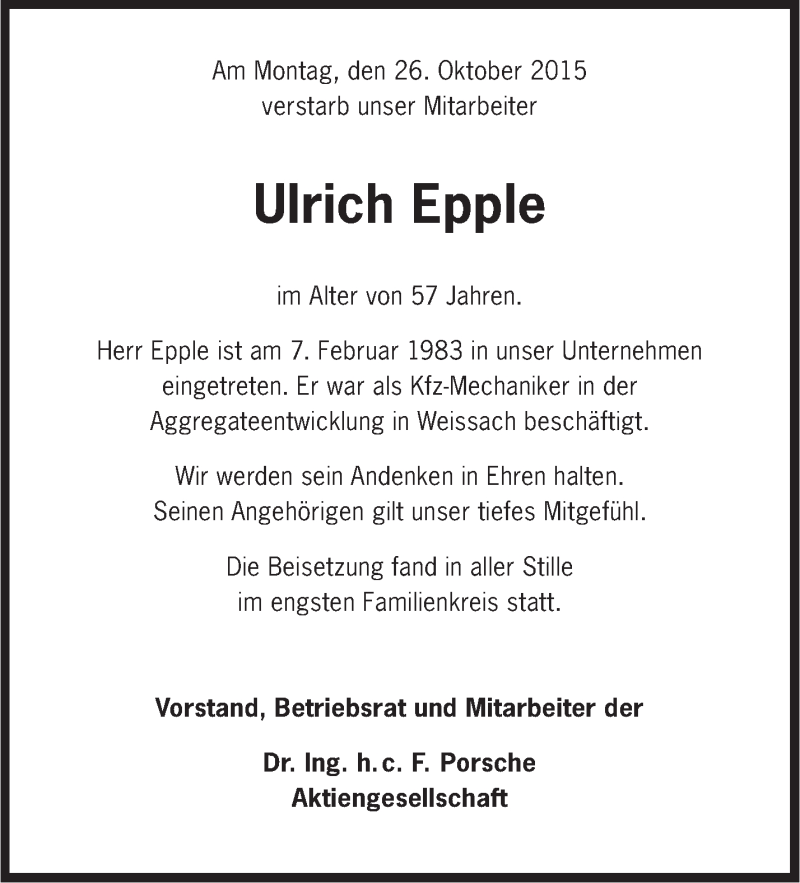 Hier finden Sie alle Traueranzeigen aus der Zeitung, die bisher für Ulrich Epple erschienen sind. Weitere Traueranzeigen, die in der Zeitung erscheinen, werden hier ebenfalls aufgelistet