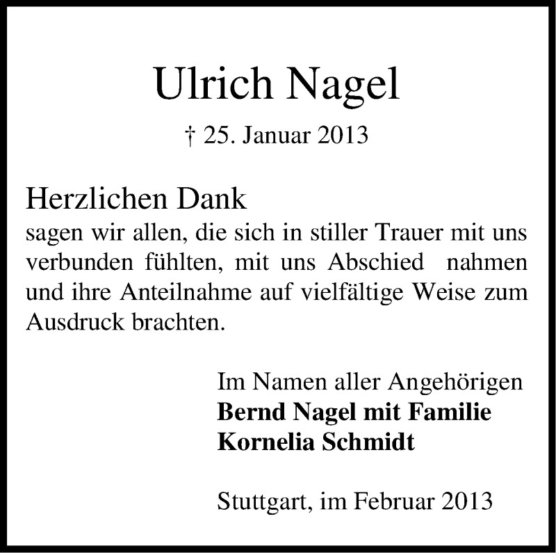 Hier finden Sie alle Traueranzeigen aus der Zeitung, die bisher für Ulrich Nagel erschienen sind. Weitere Traueranzeigen, die in der Zeitung erscheinen, werden hier ebenfalls aufgelistet